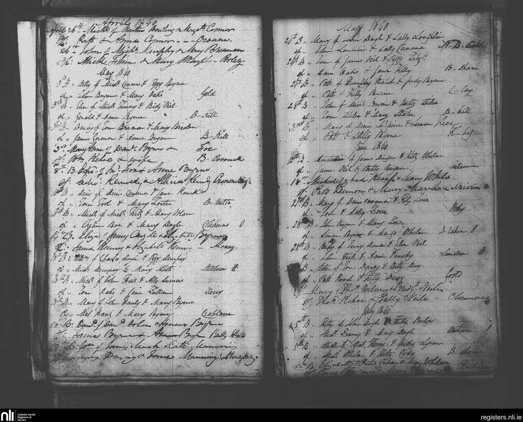 Clonmore; County of Carlow, Wicklow; Diocese of Kildare and Leighlin. Baptisms, Apr. 1840 to July 1840