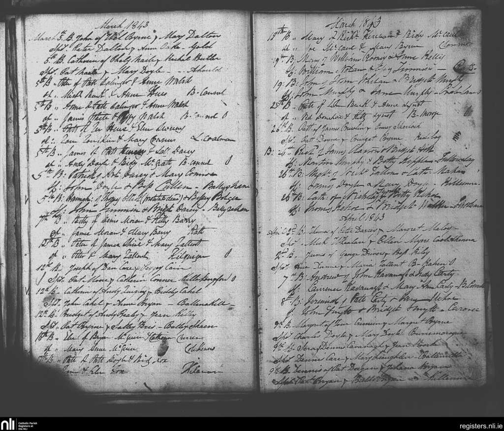 Clonmore; County of Carlow, Wicklow; Diocese of Kildare and Leighlin. Baptisms, Mar. 1843 to Apr. 1843