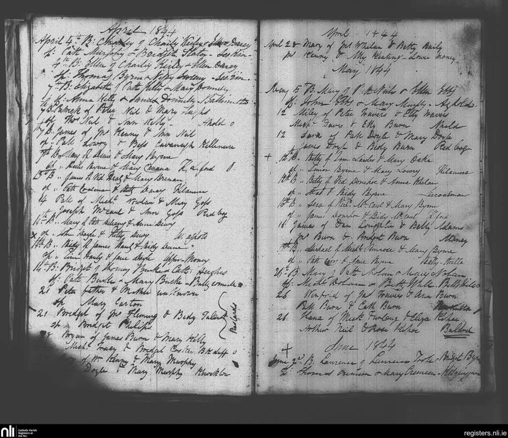 Clonmore; County of Carlow, Wicklow; Diocese of Kildare and Leighlin. Baptisms, Apr. 1844 to June 1844