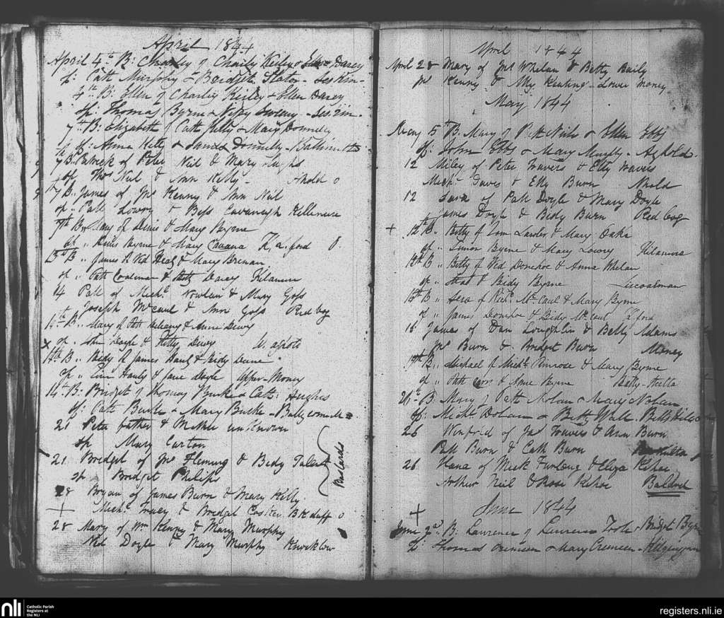 Clonmore; County of Carlow, Wicklow; Diocese of Kildare and Leighlin. Baptisms, Apr. 1844 to June 1844