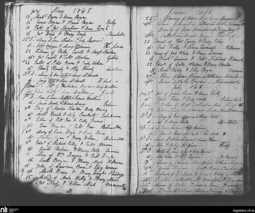 Clonmore; County of Carlow, Wicklow; Diocese of Kildare and Leighlin. Baptisms, May 1845 to July 1845