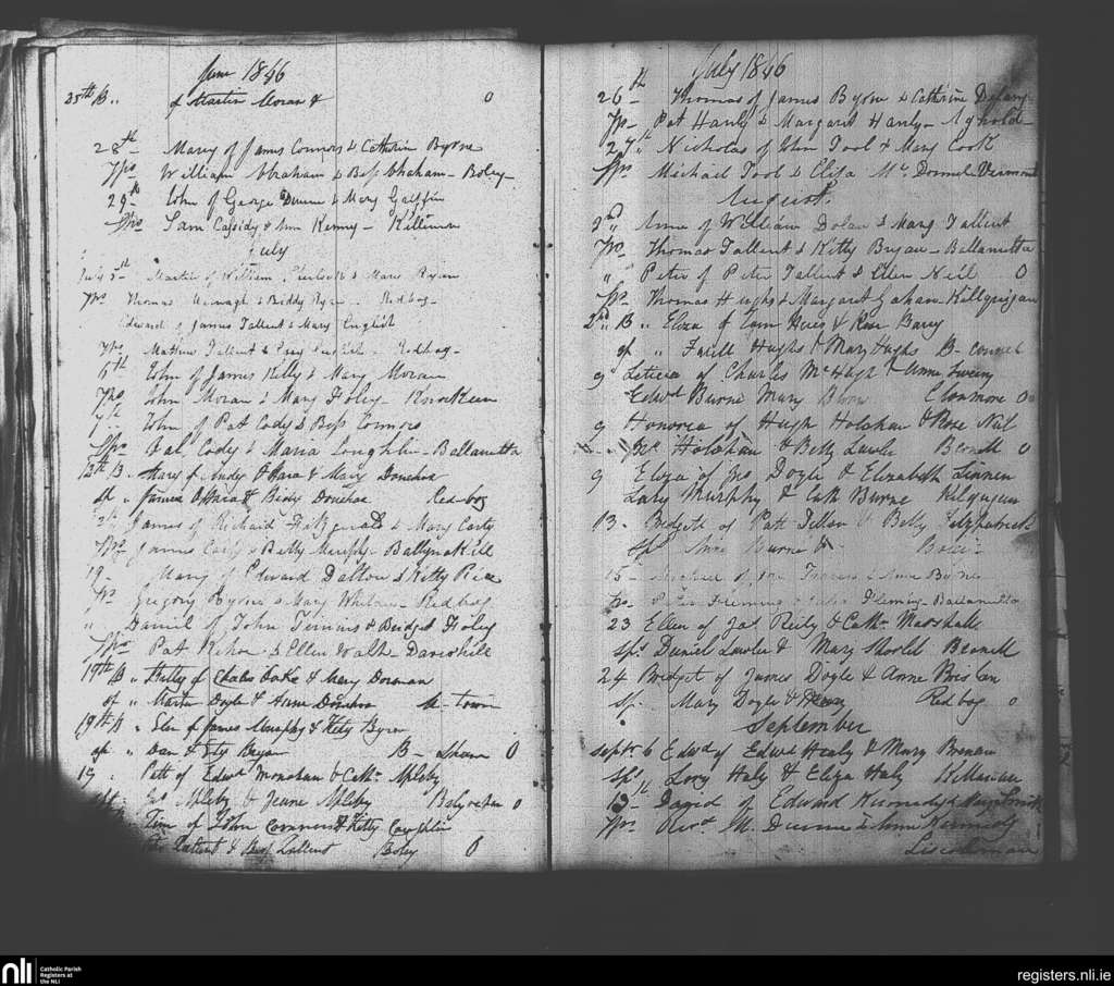 Clonmore; County of Carlow, Wicklow; Diocese of Kildare and Leighlin. Baptisms, June 1846 to Sep. 1846