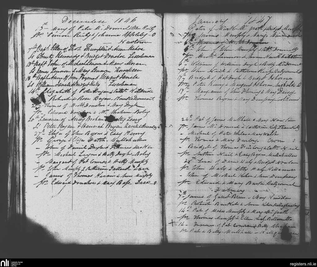 Clonmore; County of Carlow, Wicklow; Diocese of Kildare and Leighlin. Baptisms, Dec. 1846 to Feb. 1847