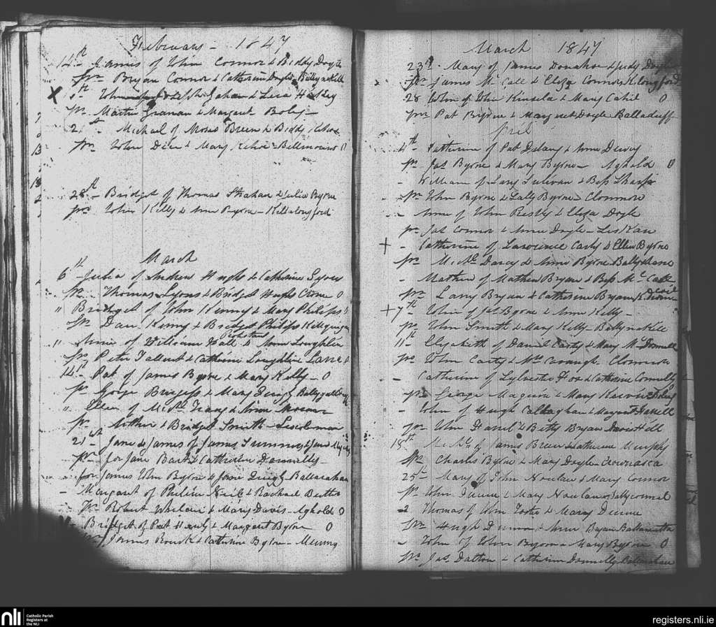 Clonmore; County of Carlow, Wicklow; Diocese of Kildare and Leighlin. Baptisms, Feb. 1847 to Apr. 1847