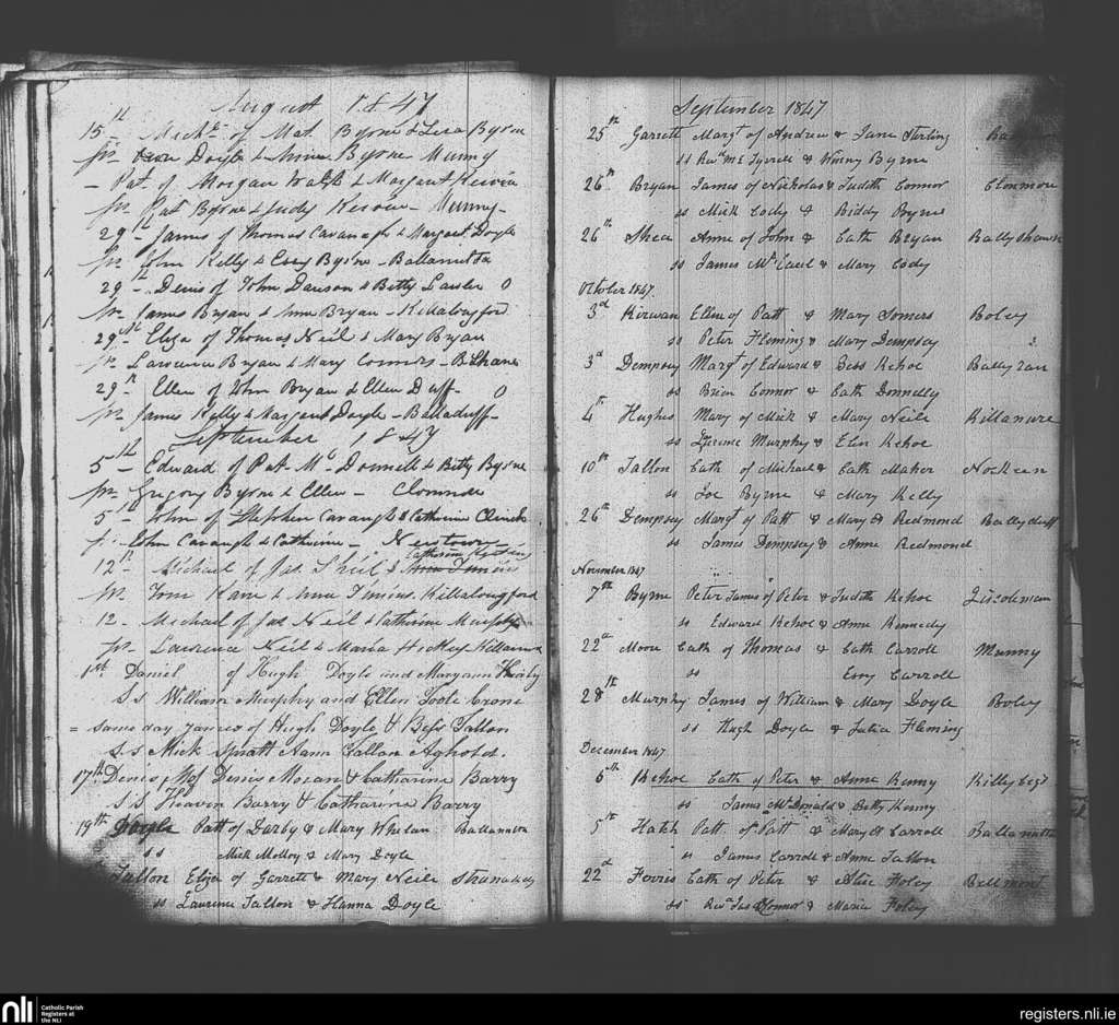 Clonmore; County of Carlow, Wicklow; Diocese of Kildare and Leighlin. Baptisms, Aug. 1847 to Dec. 1847