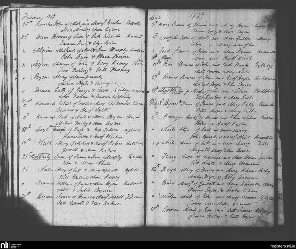 Clonmore; County of Carlow, Wicklow; Diocese of Kildare and Leighlin. Baptisms, Feb. 1849 to May 1849