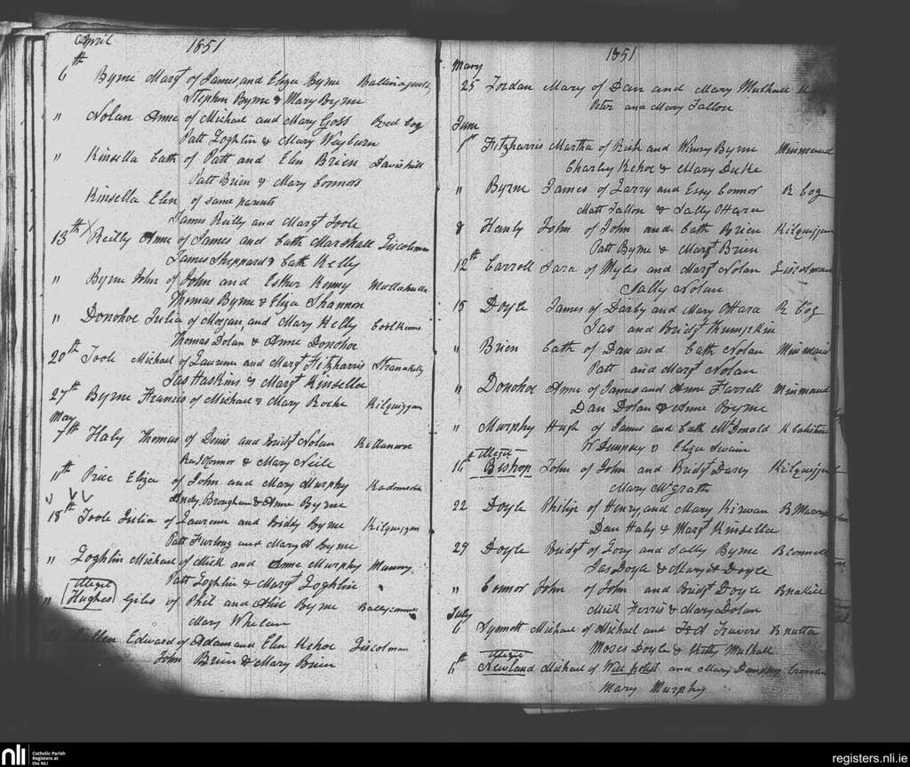 Clonmore; County of Carlow, Wicklow; Diocese of Kildare and Leighlin. Baptisms, Apr. 1851 to July 1851