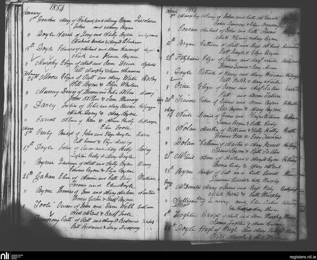 Clonmore; County of Carlow, Wicklow; Diocese of Kildare and Leighlin. Baptisms, Jan. 1854 to June 1854