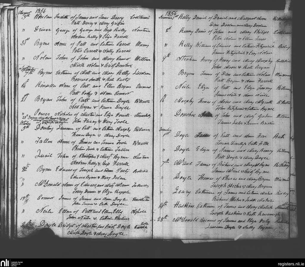 Clonmore; County of Carlow, Wicklow; Diocese of Kildare and Leighlin. Baptisms, Aug. 1856 to Dec. 1856