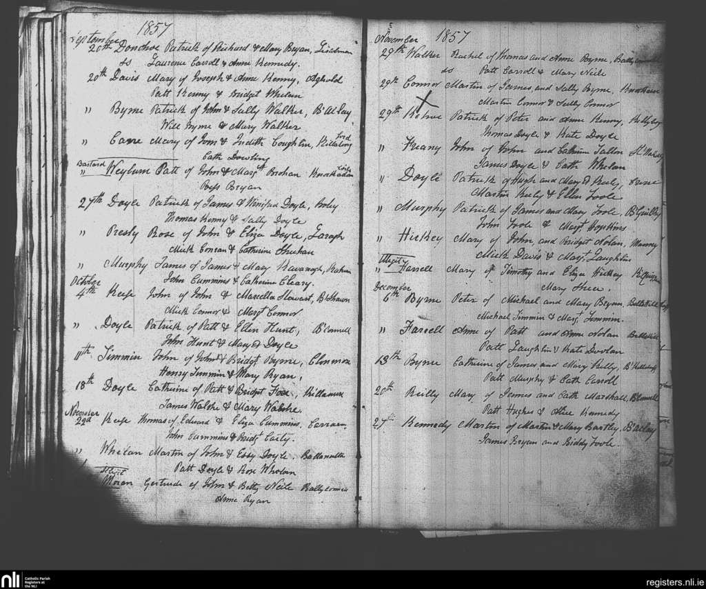 Clonmore; County of Carlow, Wicklow; Diocese of Kildare and Leighlin. Baptisms, Sep. 1857 to Dec. 1857