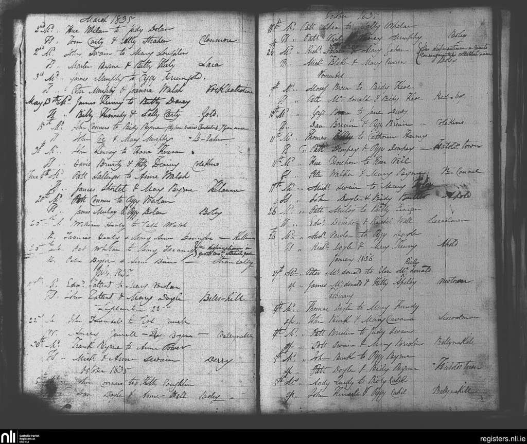 Clonmore; County of Carlow, Wicklow; Diocese of Kildare and Leighlin. Marriages, Mar. 1835 to Feb. 1836