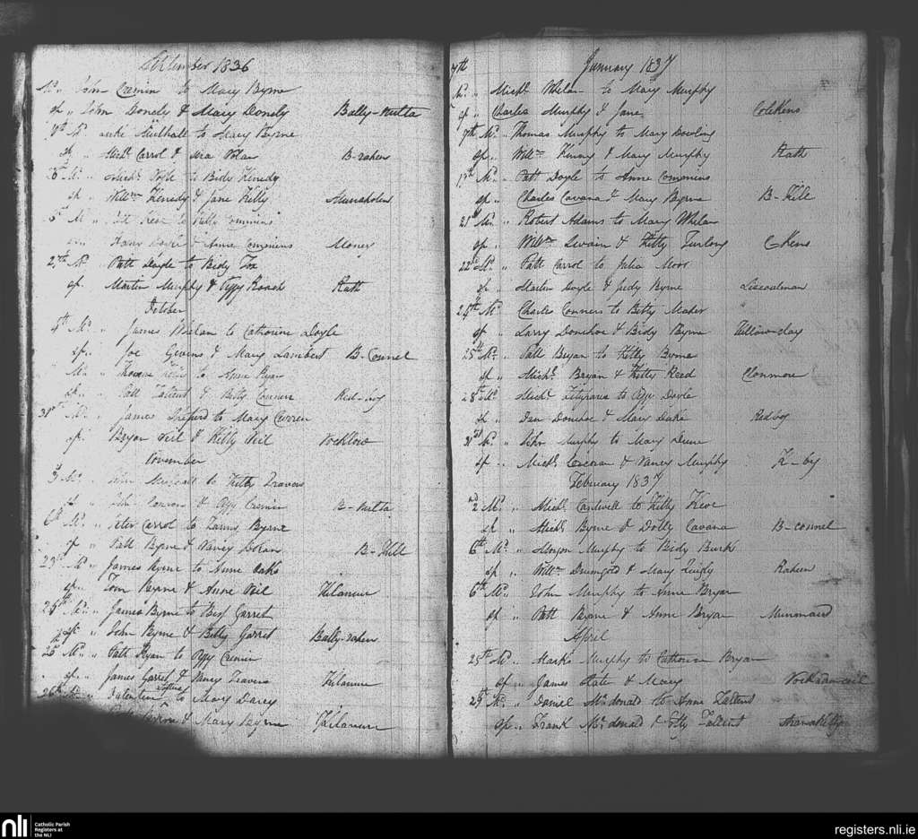 Clonmore; County of Carlow, Wicklow; Diocese of Kildare and Leighlin. Marriages, Sep. 1836 to Apr. 1837