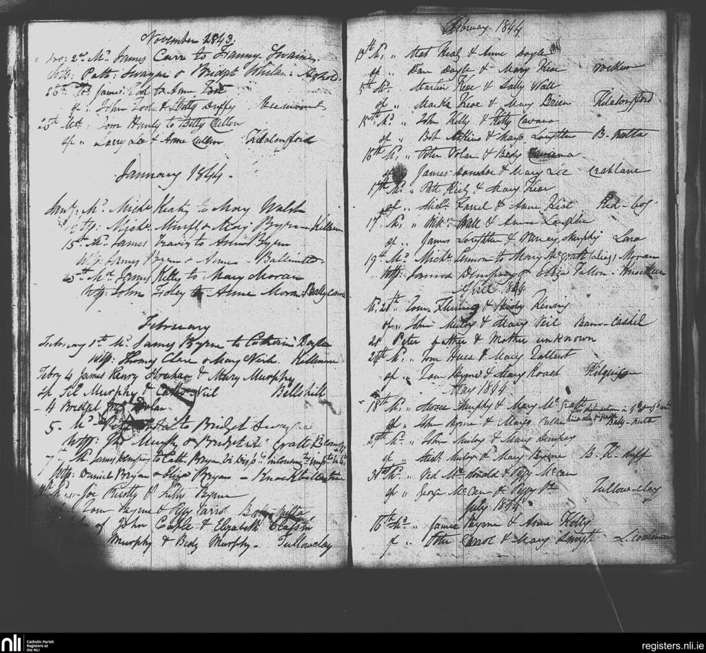 Clonmore; County of Carlow, Wicklow; Diocese of Kildare and Leighlin. Marriages, Nov. 1843 to July 1844