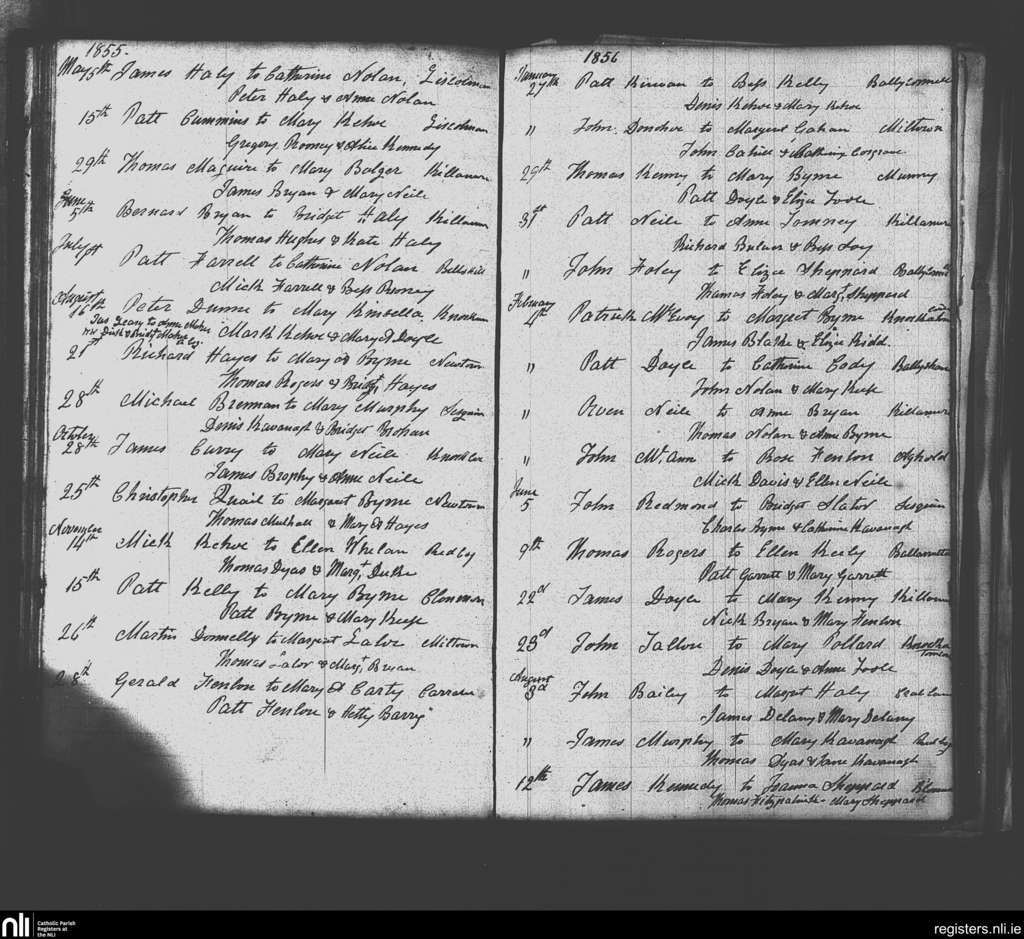 Clonmore; County of Carlow, Wicklow; Diocese of Kildare and Leighlin. Marriages, May 1855 to Aug. 1856