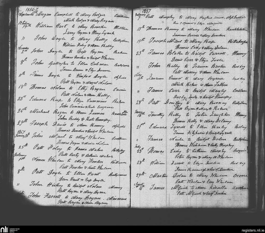 Clonmore; County of Carlow, Wicklow; Diocese of Kildare and Leighlin. Marriages, Sep. 1856 to Aug. 1857