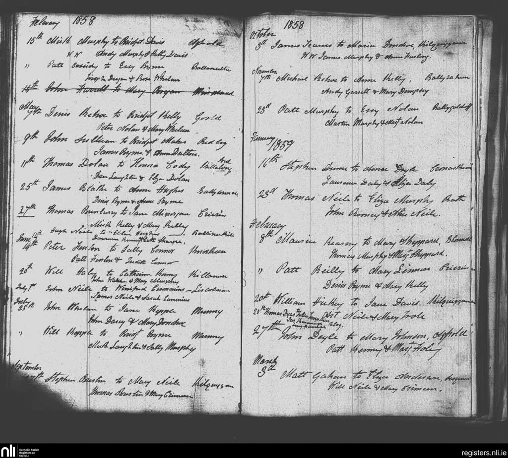 Clonmore; County of Carlow, Wicklow; Diocese of Kildare and Leighlin. Marriages, Feb. 1858 to Mar. 1859