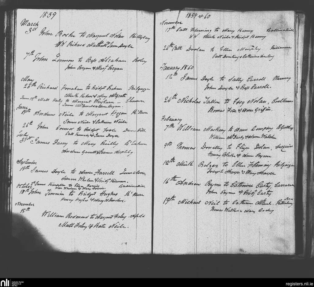 Clonmore; County of Carlow, Wicklow; Diocese of Kildare and Leighlin. Marriages, Mar. 1859 to Feb. 1860