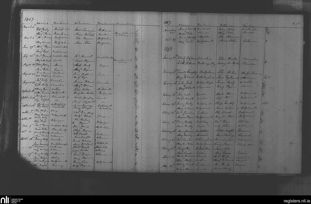 Clonmore; County of Carlow, Wicklow; Diocese of Kildare and Leighlin. Marriages, Mar. 1867 to May 1868