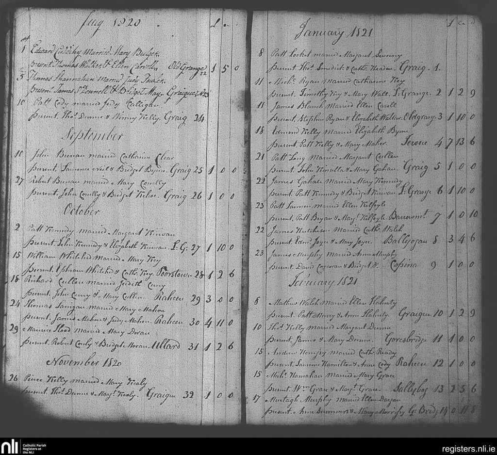 Graignamanagh; County of Carlow, Kilkenny; Diocese of Kildare and Leighlin. Marriages, July 1820 to Feb. 1821