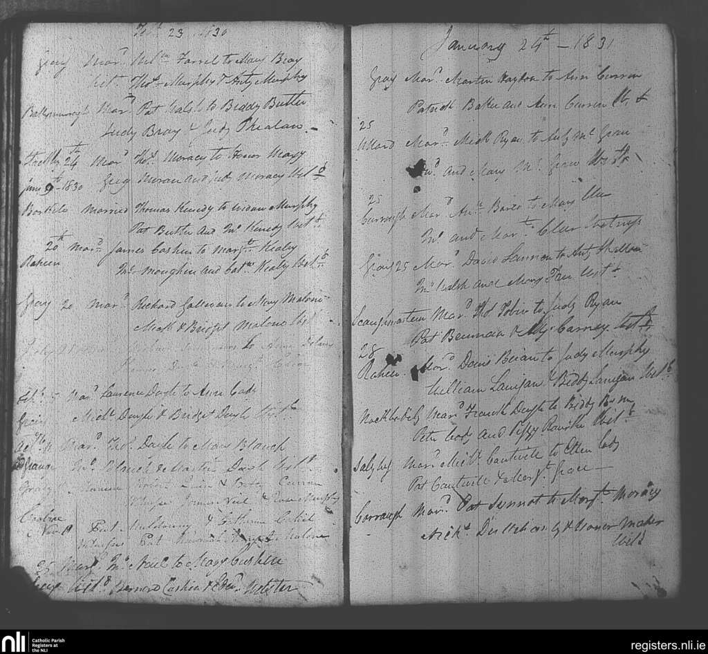 Graignamanagh; County of Carlow, Kilkenny; Diocese of Kildare and Leighlin. Marriages, Feb. 1830 to Jan. 1831