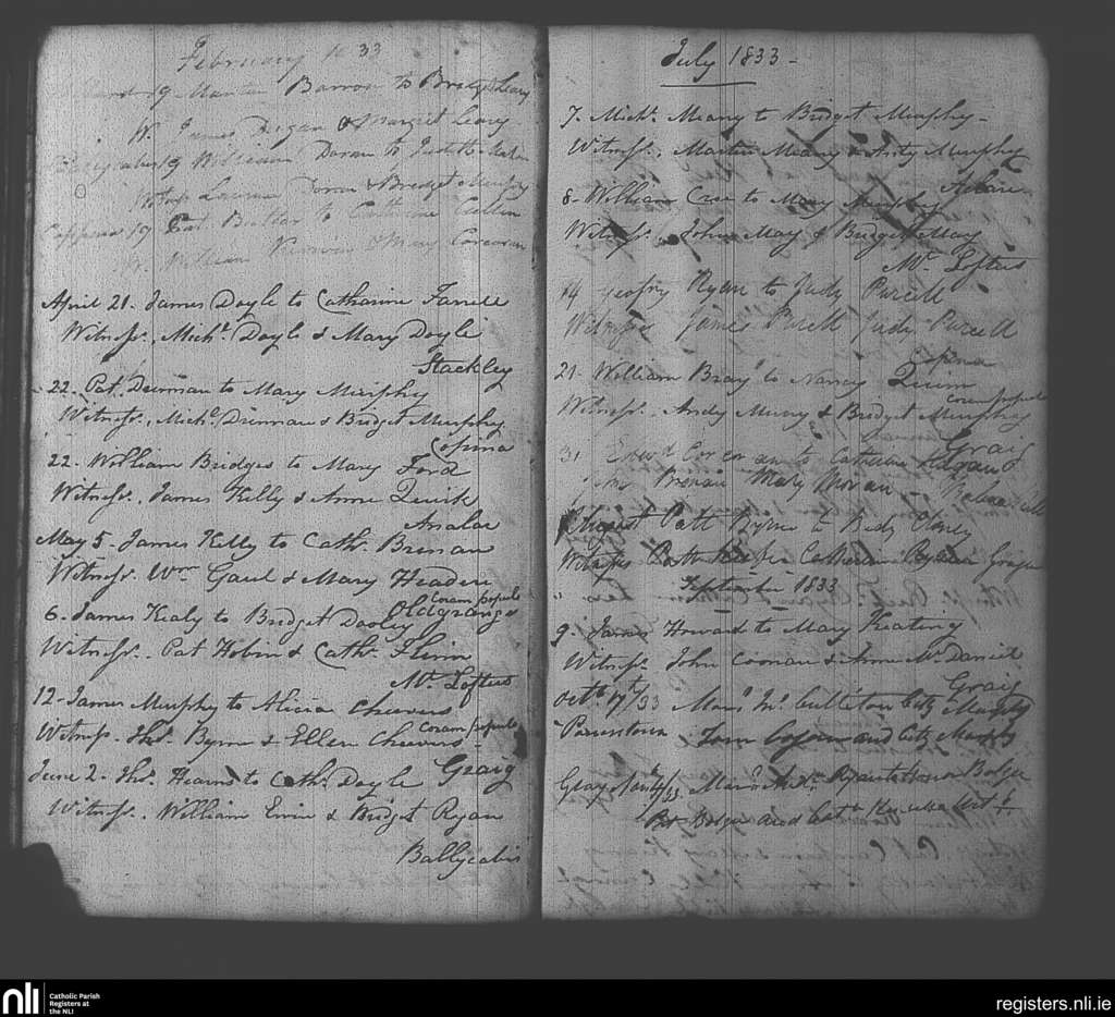 Graignamanagh; County of Carlow, Kilkenny; Diocese of Kildare and Leighlin. Marriages, Feb. 1833 to Oct. 1833