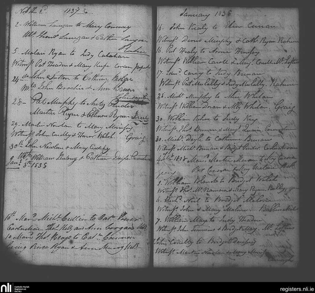 Graignamanagh; County of Carlow, Kilkenny; Diocese of Kildare and Leighlin. Marriages, Nov. 1837 to Feb. 1838