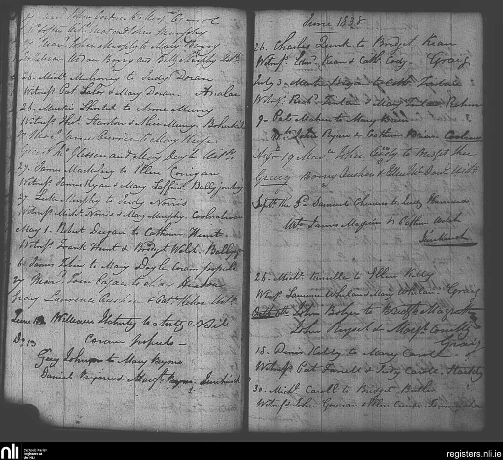 Graignamanagh; County of Carlow, Kilkenny; Diocese of Kildare and Leighlin. Marriages, Feb. 1838 to Oct. 1838