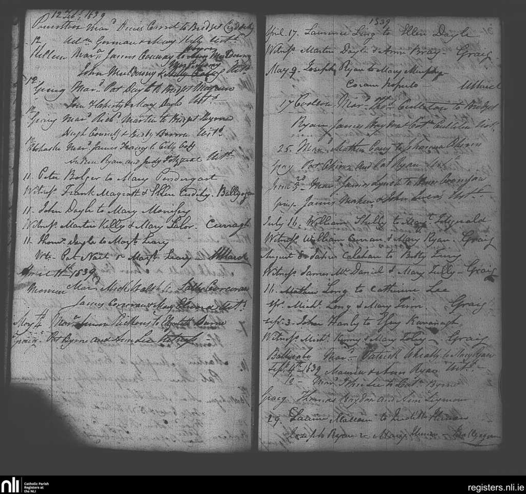 Graignamanagh; County of Carlow, Kilkenny; Diocese of Kildare and Leighlin. Marriages, Feb. 1839 to Sep. 1839