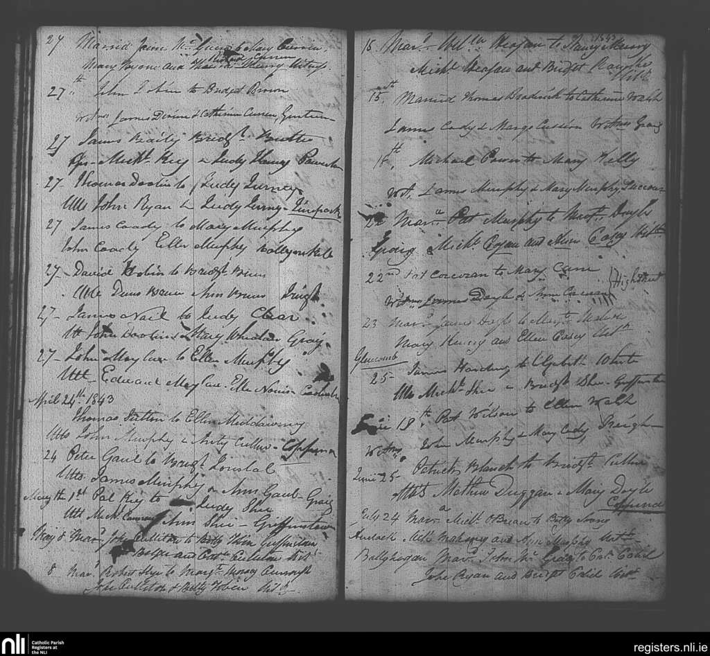 Graignamanagh; County of Carlow, Kilkenny; Diocese of Kildare and Leighlin. Marriages, Feb. 1843 to July 1843