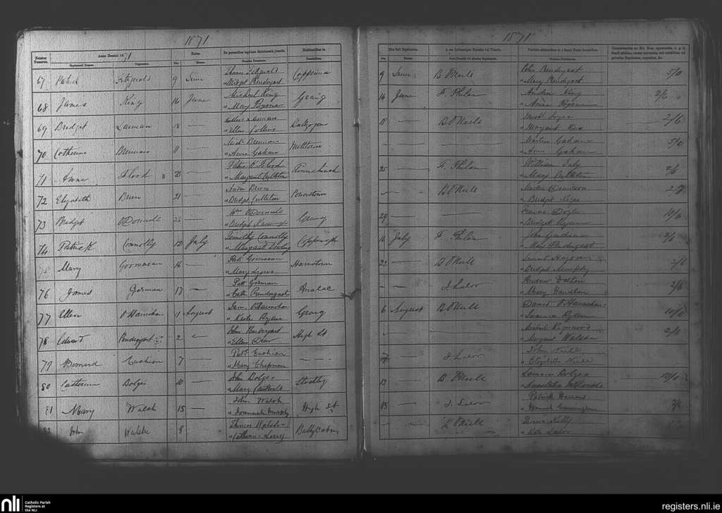 Graignamanagh; County of Carlow, Kilkenny; Diocese of Kildare and Leighlin. Baptisms, June 1871 to Aug. 1871