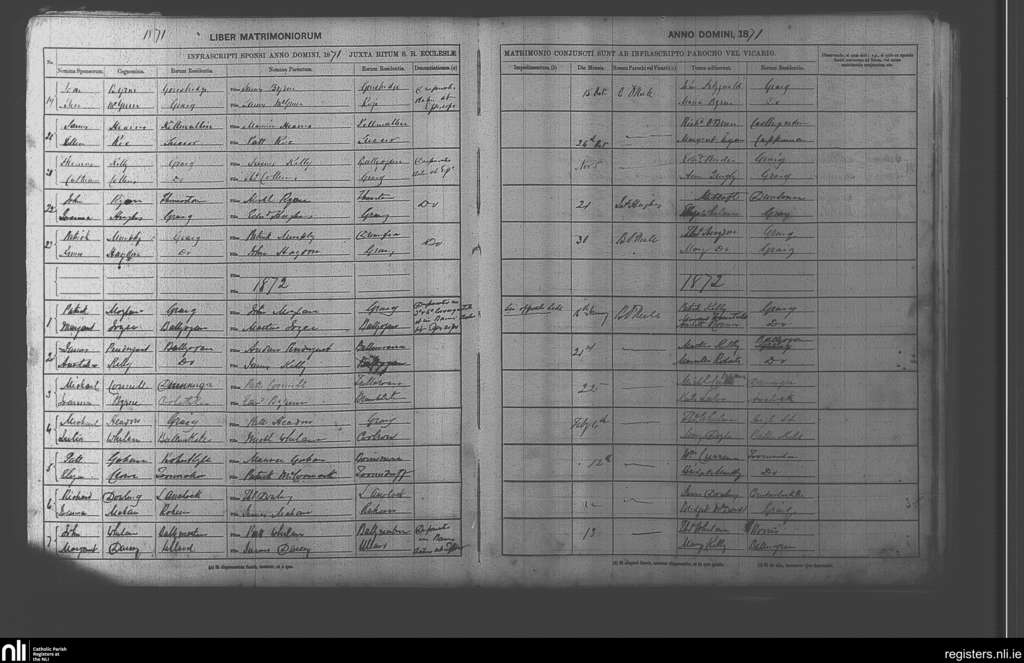 Graignamanagh; County of Carlow, Kilkenny; Diocese of Kildare and Leighlin. Marriages, Oct. 1871 to Feb. 1872