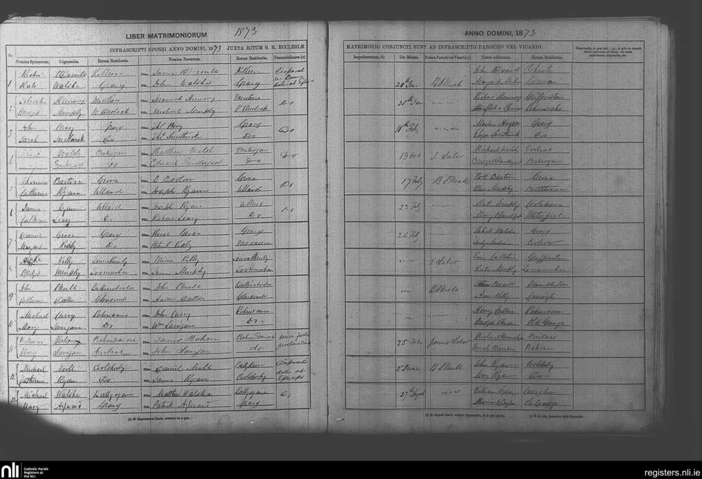 Graignamanagh; County of Carlow, Kilkenny; Diocese of Kildare and Leighlin. Marriages, Jan. 1873 to Aug. 1873