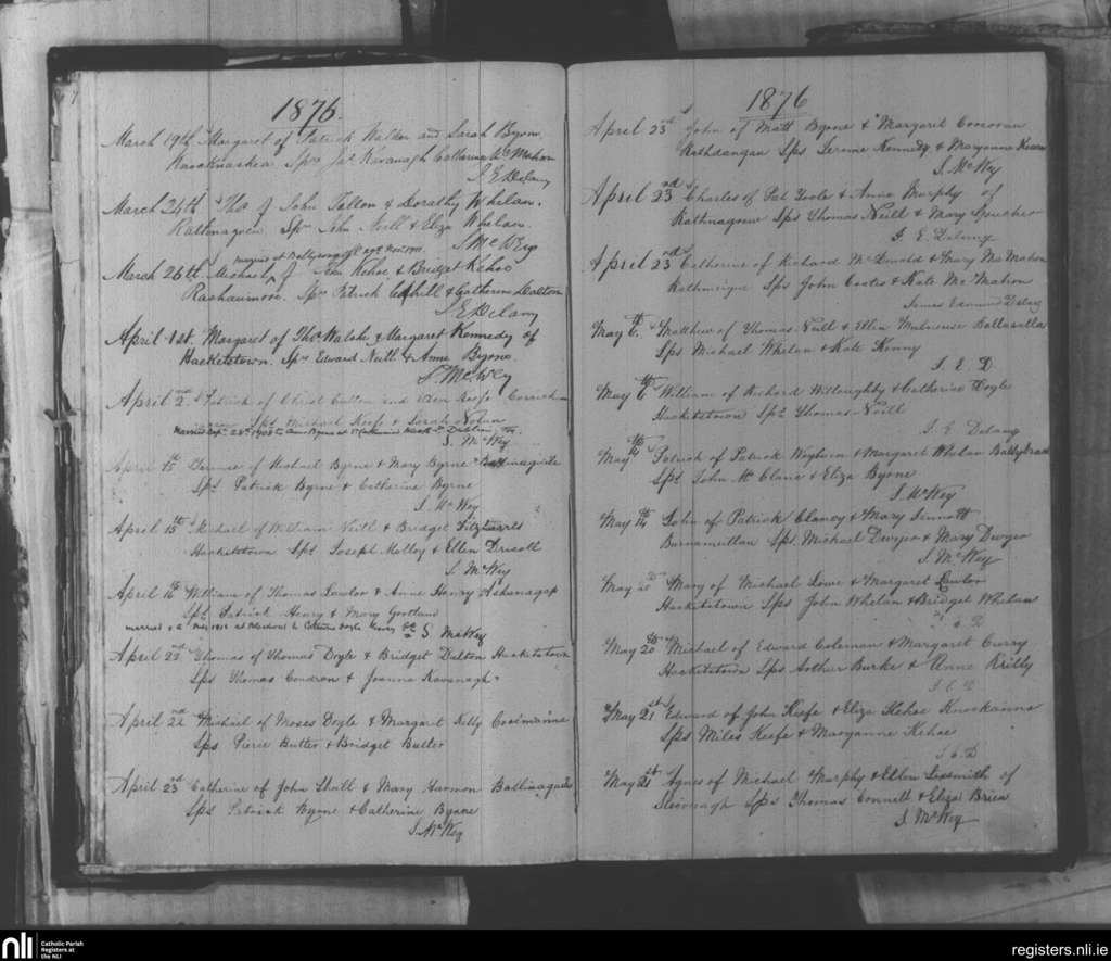 Hacketstown; County of Carlow, Wicklow; Diocese of Kildare and Leighlin. Baptisms, Mar. 1876 to May 1876
