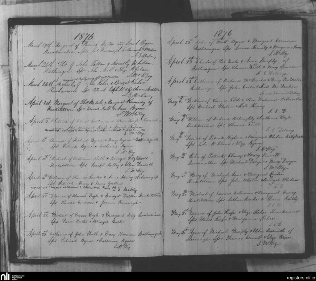 Hacketstown; County of Carlow, Wicklow; Diocese of Kildare and Leighlin. Baptisms, Mar. 1876 to May 1876