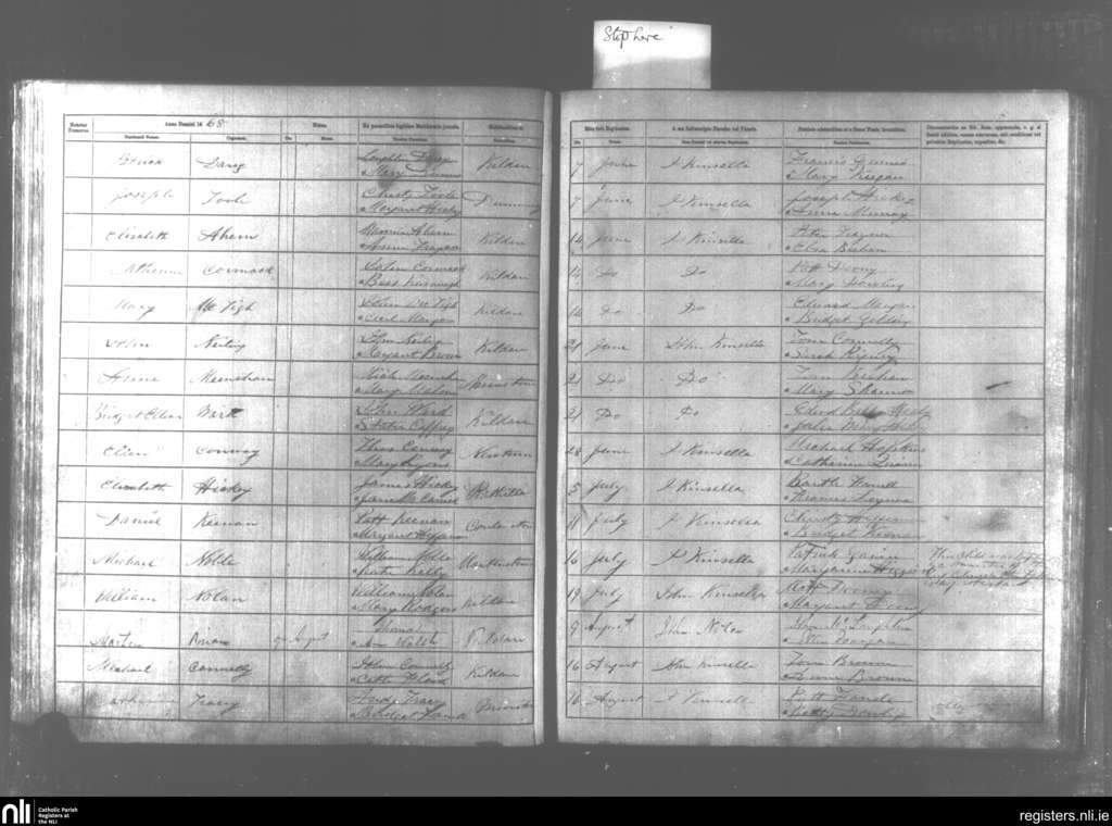 Kildare and Rathangan; County of Kildare; Diocese of Kildare and Leighlin. Baptisms, June 1868 to Aug. 1868