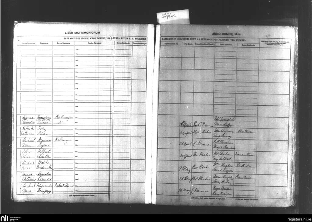 Kildare and Rathangan; County of Kildare; Diocese of Kildare and Leighlin. Marriages, Apr. 1864 to May 1864
