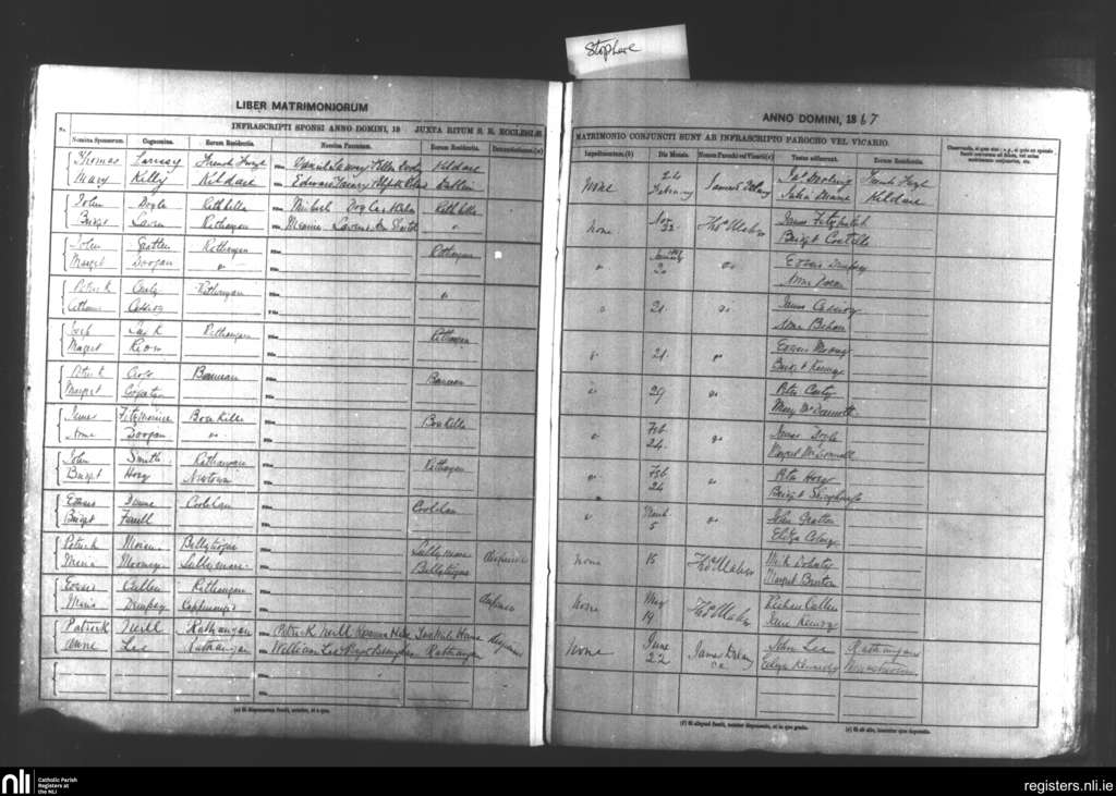 Kildare and Rathangan; County of Kildare; Diocese of Kildare and Leighlin. Marriages, Jan. 1867 to Nov. 1867