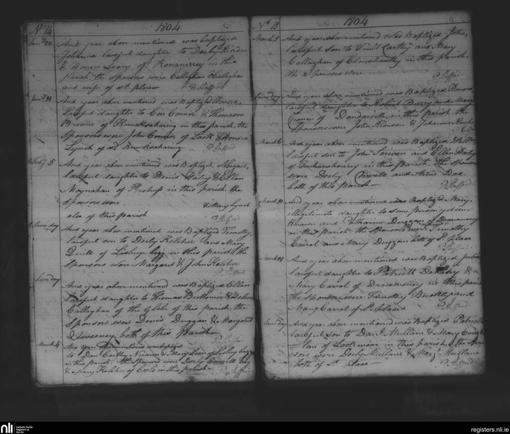 Kilnamartyra; County of Cork; Diocese of Cloyne. Baptisms, Jan. 1804 to Mar. 1804