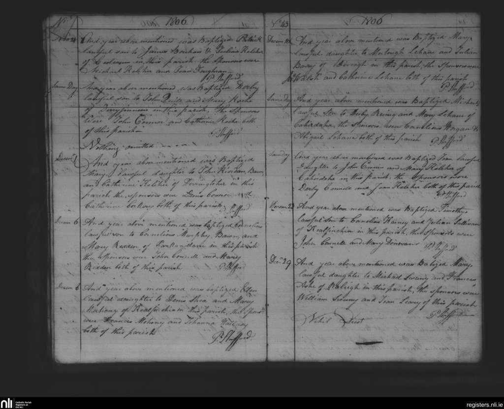 Kilnamartyra; County of Cork; Diocese of Cloyne. Baptisms, Nov. 1806 to Dec. 1806