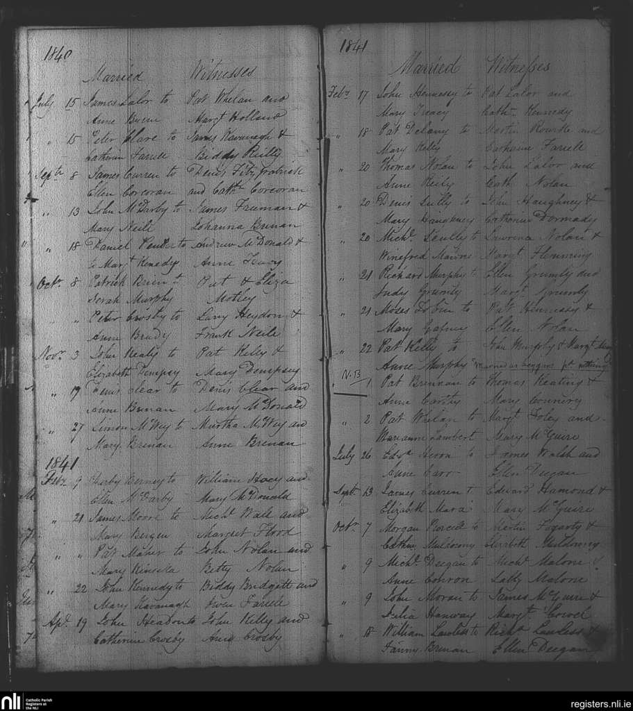 Killeshin; County of Laois; Diocese of Kildare and Leighlin. Marriages, July 1840 to Oct. 1841
