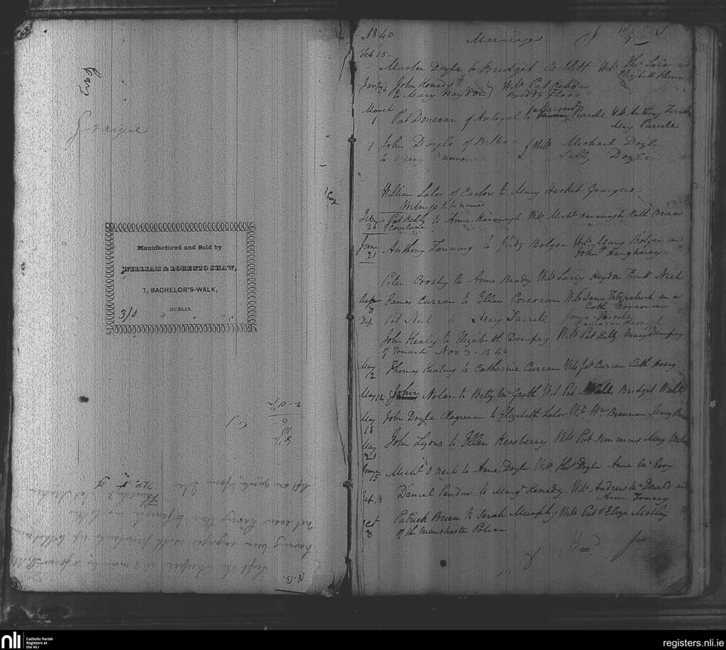 Killeshin; County of Laois; Diocese of Kildare and Leighlin. Marriages, Jan. 1840 to Oct. 1840