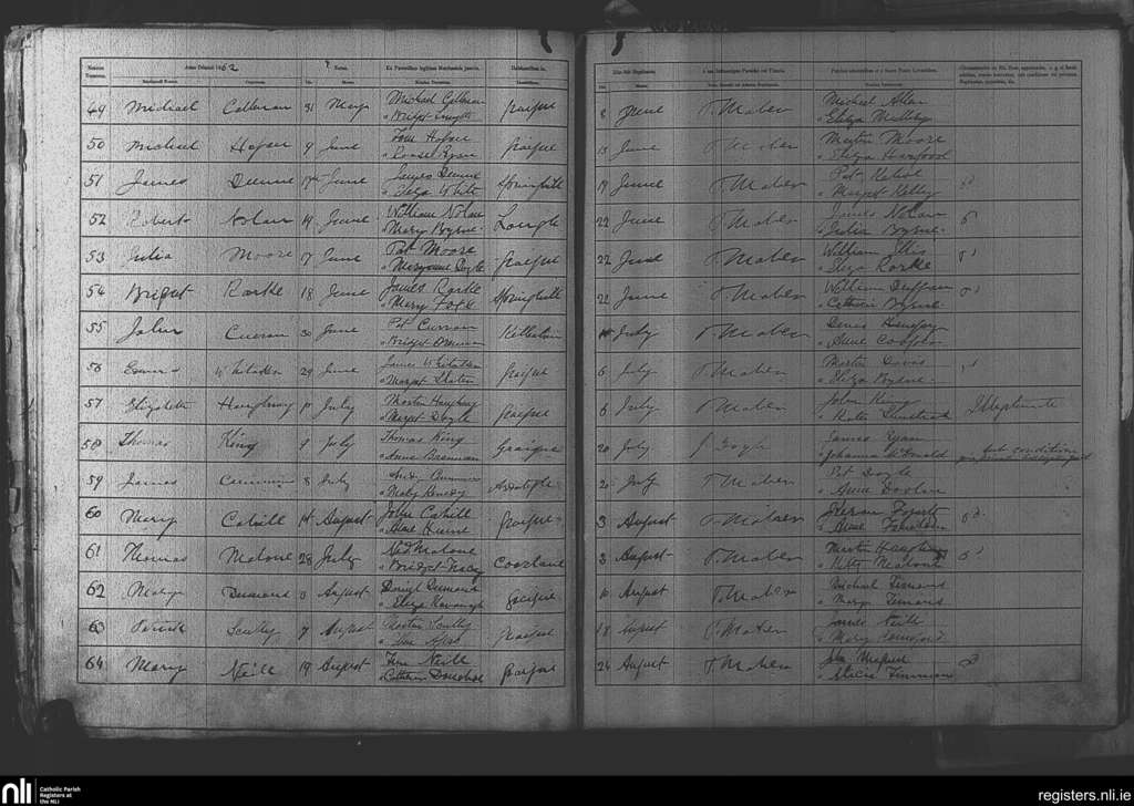 Killeshin; County of Laois; Diocese of Kildare and Leighlin. Baptisms, June 1862 to Aug. 1862