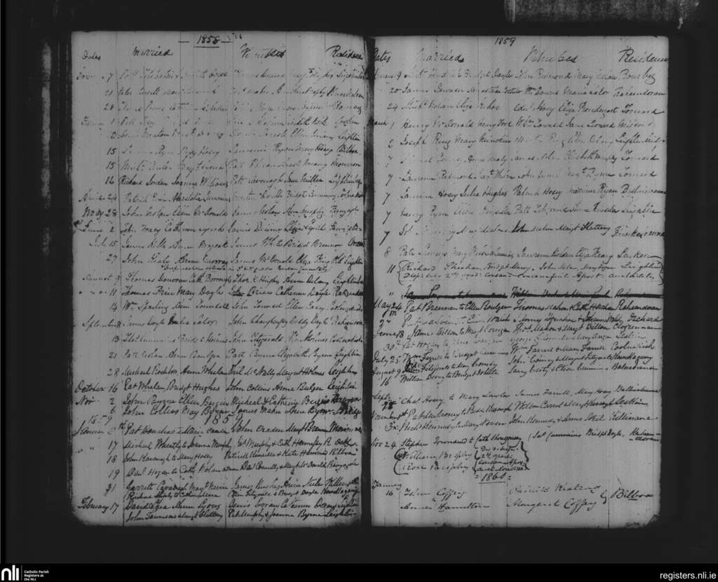 Leighlinbridge; County of Carlow, Laois; Diocese of Kildare and Leighlin. Marriages, Jan. 1858 to Jan. 1860