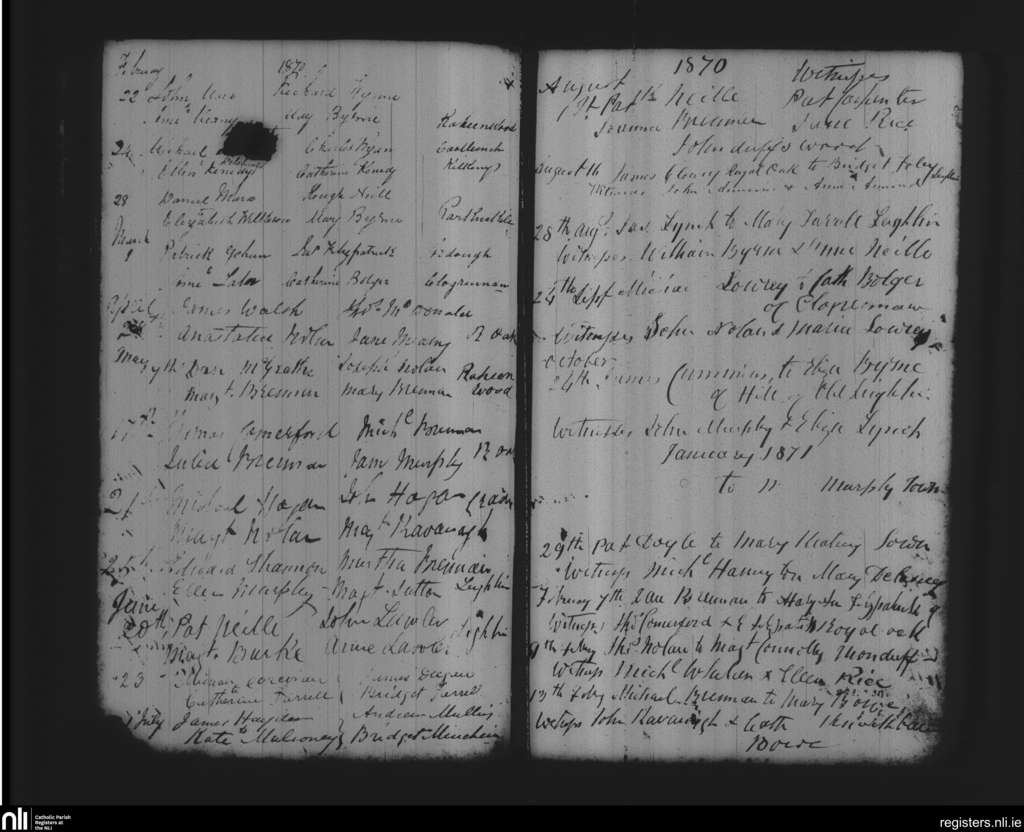 Leighlinbridge; County of Carlow, Laois; Diocese of Kildare and Leighlin. Marriages, Feb. 1870 to Feb. 1871