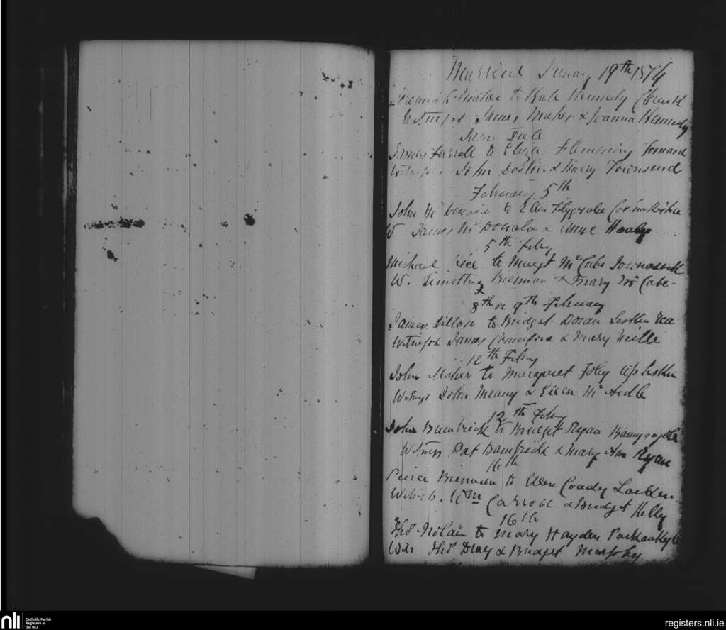 Leighlinbridge; County of Carlow, Laois; Diocese of Kildare and Leighlin. Marriages, Jan. 1874 to Feb. 1874
