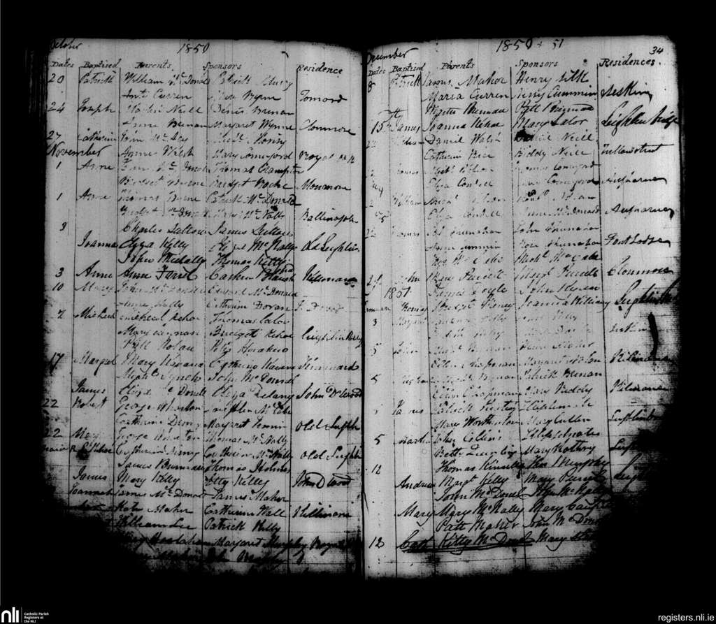 Leighlinbridge; County of Carlow, Laois; Diocese of Kildare and Leighlin. Baptisms, Oct. 1850 to Jan. 1851