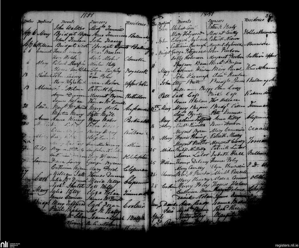 Leighlinbridge; County of Carlow, Laois; Diocese of Kildare and Leighlin. Baptisms, Apr. 1851 to June 1851