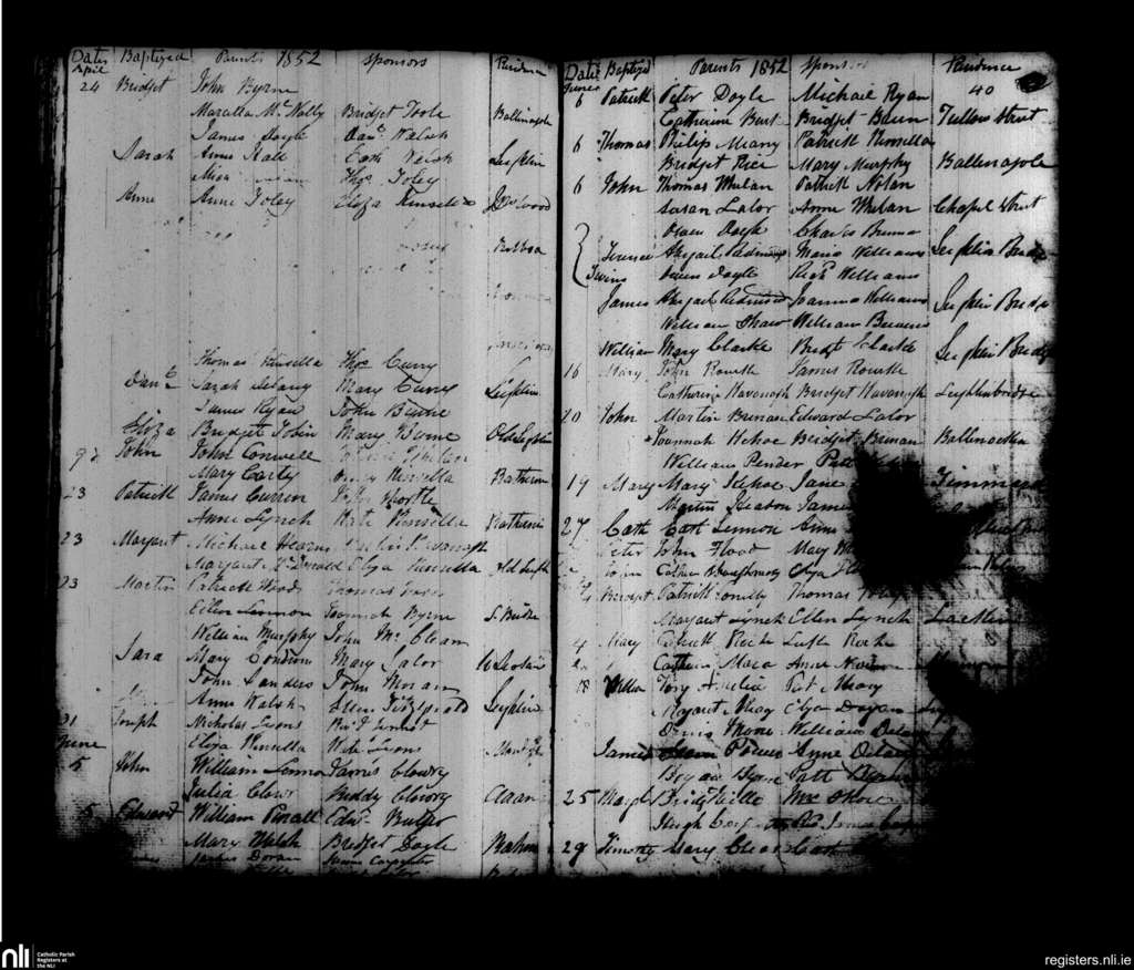 Leighlinbridge; County of Carlow, Laois; Diocese of Kildare and Leighlin. Baptisms, Apr. 1852 to July 1852