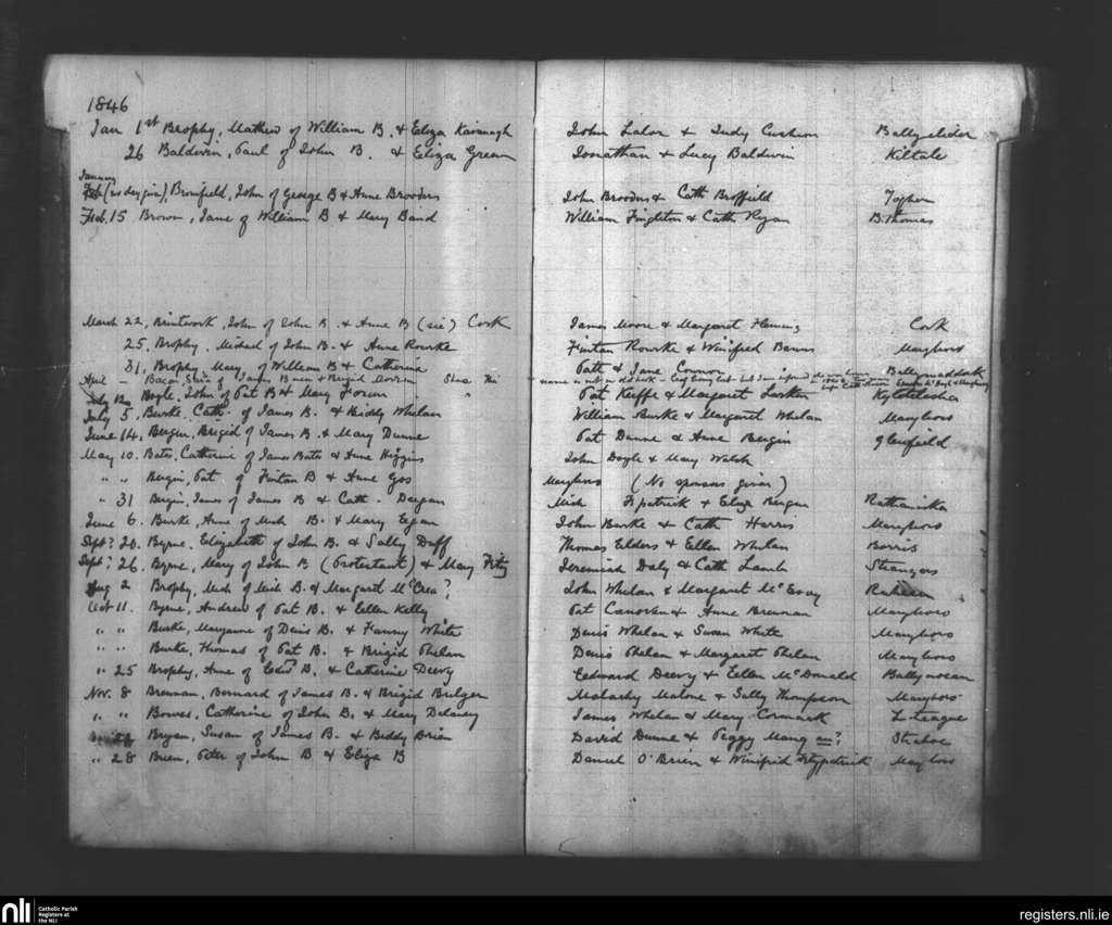 Maryborough; County of Laois; Diocese of Kildare and Leighlin. Baptisms, Jan. 1846 to Nov. 1846