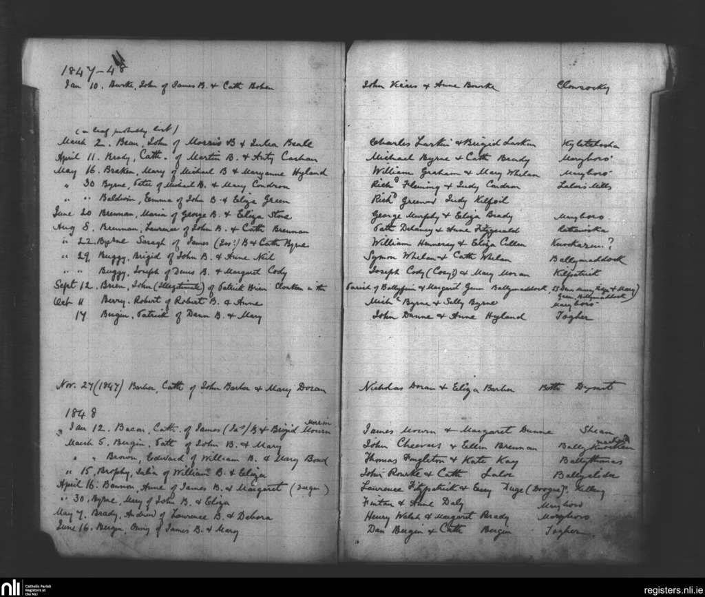 Maryborough; County of Laois; Diocese of Kildare and Leighlin. Baptisms, Jan. 1847 to June 1848
